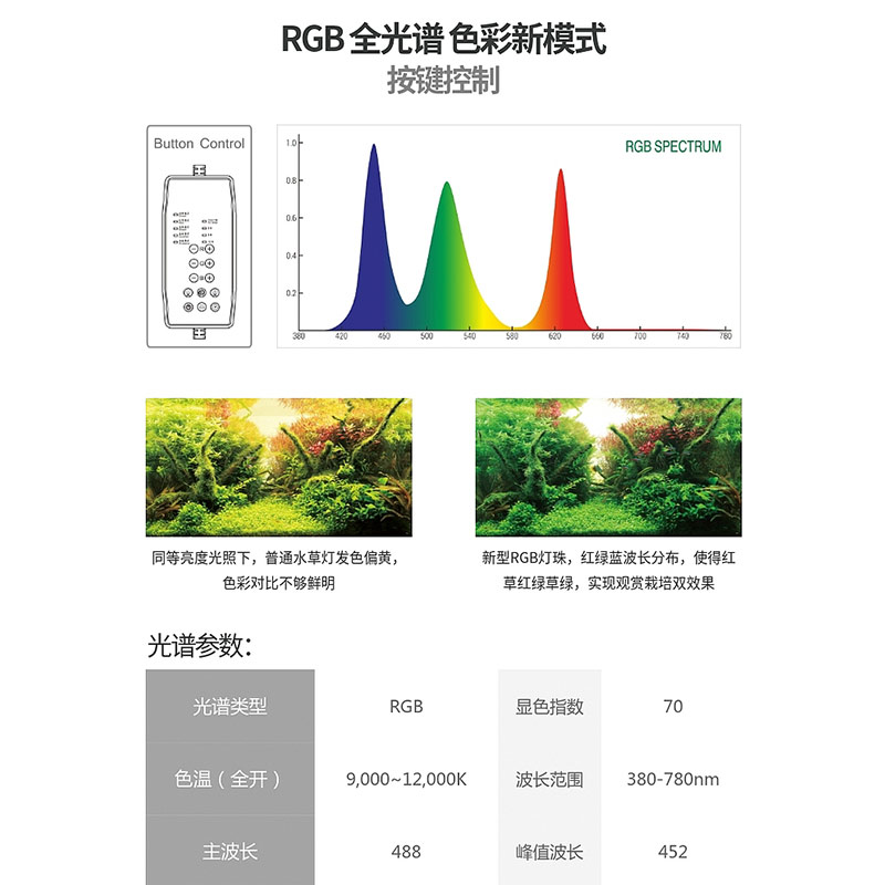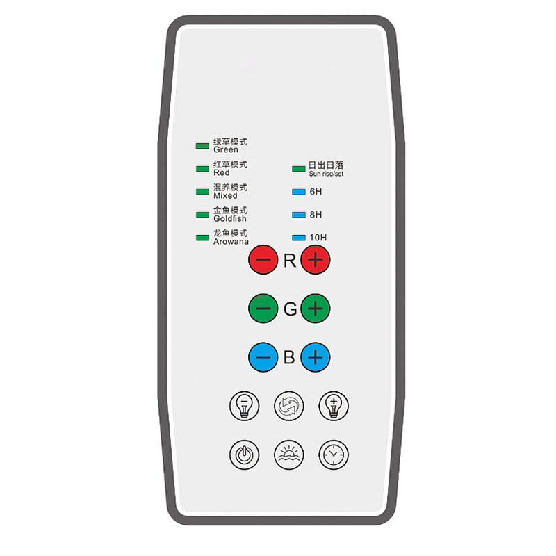 简介:有绿草模式、红草模式、混养模式、金鱼模式、龙鱼五种模式 ,模拟日出日落搭配定时功能(e+f同时开)R红 G绿 B蓝 三种光可单独调亮度,拥有无极调光和定时功能 。