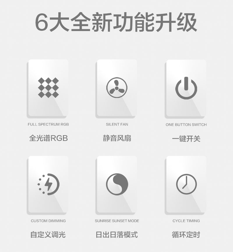 简介:有绿草模式、红草模式、混养模式、金鱼模式、龙鱼五种模式 ,模拟日出日落搭配定时功能(e+f同时开)R红 G绿 B蓝 三种光可单独调亮度,拥有无极调光和定时功能 。