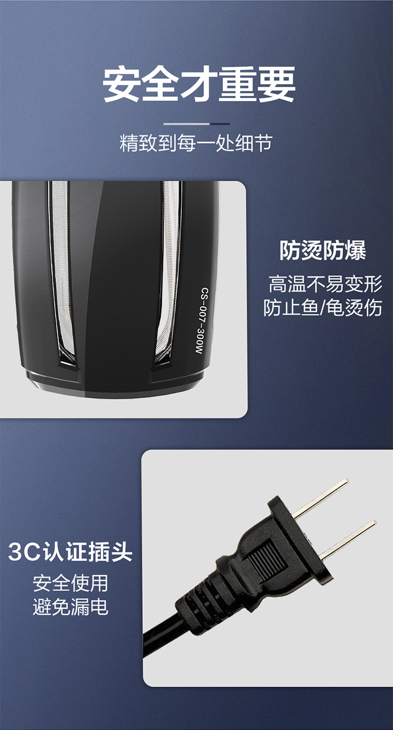 特点:防烫防爆材质,3C认证插头,安全不漏电,离水断电,变频省电一半,超温保护,精准设置,控温无误差。